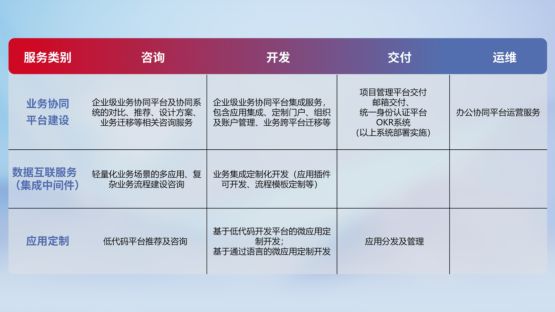 针对钉钉、、、、企微、、、IDaas等平台级产品提供产品的规划、、方案、、、、交付、、定制化开发等服务,,,,实现如统一协同办公、、、、智能客户服务、、、混合会议管理、、、、智能数据查询、、等业务场景,,,实现数字化转型。。。