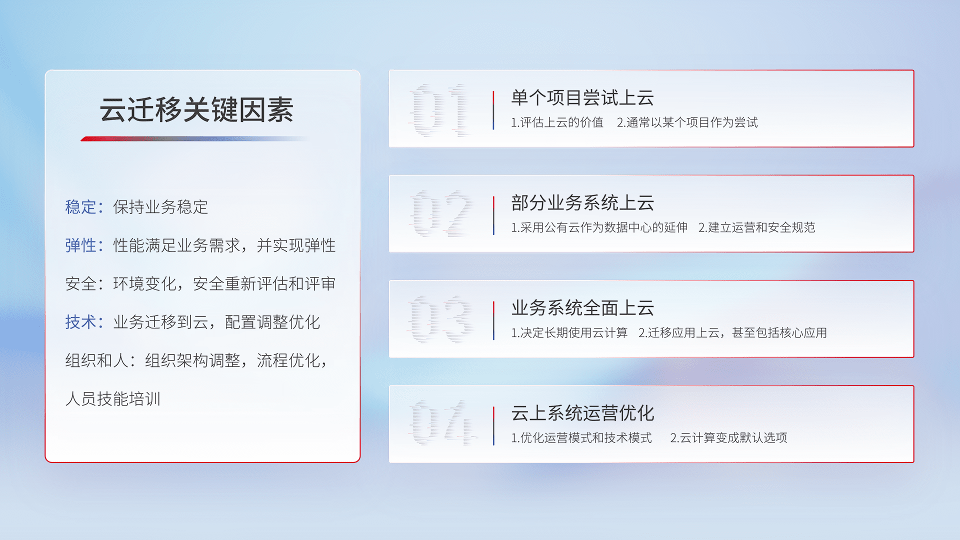 结合实际业务,,从规划设计、、、、云平台选型、、、、云原生改造、、、、数据迁移、、、、集成交付,,,迁移全过程为客户识别最佳上云路径,,,做好风险识别管理,,设计网络架构、、、身份权限、、、安全审计合规、、、操作审计、、日志审计、、监控告警策略、、多站点容灾设计等,,,,对云上基础设施进行整体规划,,提升IT治理水平,,,,以满足弹性、、、高可用、、高性能的需求。。。。