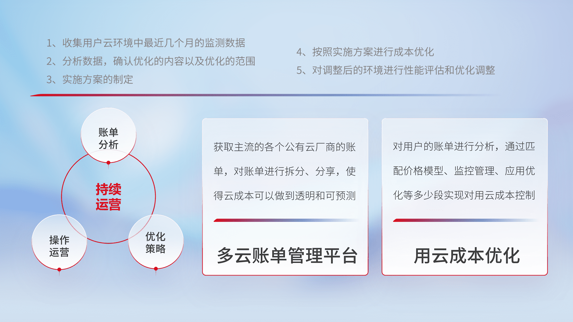 通过多云纳管,,,以统一的资源数据模型把客户的云资源进行抽象和封装,,,进而实现对多云资源的统一操作,,,保障云资源管理的可靠性、、、、稳定性与可用性。。。量身定制化运维内容,,配置、、、、开发运维、、、、补丁管理、、、备份、、监控、、认证和访问管理、、审计和日常巡检等,,,,保障在用云过程中的可靠度,,稳定度以及高可用率。。