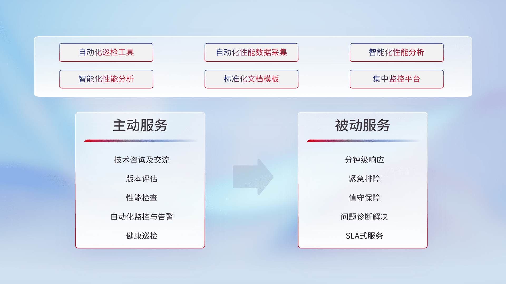 智能化工具和标准化文档,,保障服务质量,,,,提供主动服务(包含技术咨询、、、版本评估、、性能检查、、自动化监控与告警、、、健康巡检)和被动服务包含(分钟级响应、、、、紧急排障、、、、值守保障、、问题诊断解决、、SLA服务)。。